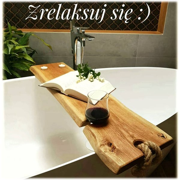 Deska posiada wycięcie na kieliszek wina oraz specjalne miejsce na świeczki (sznur w zestawie), co pozwala stworzyć przyjemną atmosferę podczas kąpieli. Cena tej wersji wynosi 180 zł. Istnieje również możliwość zamówienia deski bez otworów i sznura w niższej cenie – 165 zł. Każda deska jest wykonywana indywidualnie, dlatego mogę dopasować jej wymiary do konkretnej wanny – długość od 65 cm do 90 cm, szerokość około 22–25 cm, grubość około 2,5 cm.